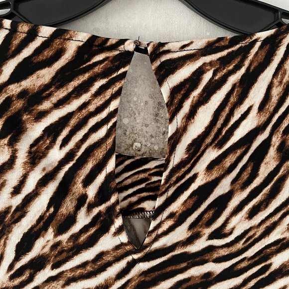 Size: X-Large and Medium (See lay flat measurements below). Color: Dark Camel. 95% polyester; 5% elastane. Keyhole button closure. Elasticized fabric. Slight gathering on left side. Vibrant animal print fabric. Decorative gold chain across neckline.