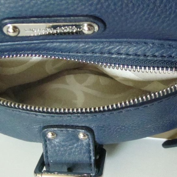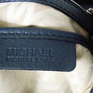 Beautiful medium-dark blue pebbled leather. Super soft and slouchy. All silver tone hardware with MK hanging charm. Unlike other Austin handbags, this one is made with a richer, cream & off white MK jacquard fabric lining. Note: This is NOT an outlet bag! Those are the ones with the grey satin type of interior. This is a full retail bag and made with better quality leather and fabric. Ergo, the price difference.
