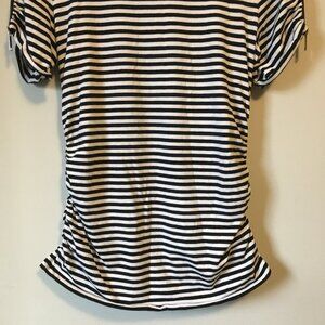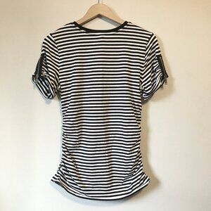 Very good preowned condition, black and white striped, short sleeve cotton blend tee by Michael Kors. The sleeves have zippers inserted on them all the way down and there is ruching about the bodice of this eclectic top. Very cool.