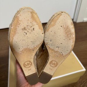 Beige lace-up wedges, laces wrap around the ankles. Size 5