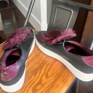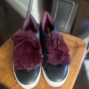 Michael Kors Black & Burgundy Fur Pom Sneakers – Size 8.5 – Statement Shoes