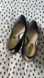 Well loved/worn black leather Michael Kors 3+ inch heels with gold detailing at back.