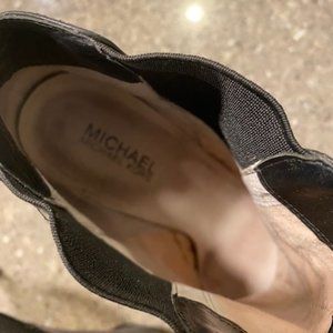 Super comfy MK Black Leather Bootie, Size 10. These booties are comfy and easy to walk in considering they are 5" high (with a 1" platform). Excellent condition, no scuffs or wear (they look a little crinkled as they have been sitting in storage for awhile). The ankle shaft fits close to the ankle. Slip on.