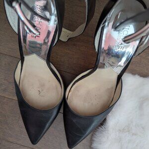 These black Michael Kors leather high heels are perfect for your next wedding or Christmas party! They feature an adjustable ankle strap with a silver buckle, a chic pointed toe with à platform for added comfort. These have been worn a few times, always indoors, and are in good used condition. There are a few scratches especially on the interior aspect of the upper as well as signs of wear on the insole ans inside of the straps. I'm selling these because they are slightly too big for me (I'm a 9.5) and I thought I could make them work.