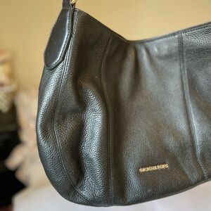 Chic black leather shoulder bag. Features signature logo charm. Ideal for versatile styling.