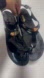 Stylish black sandals featuring gold accents. Perfect for casual wear.