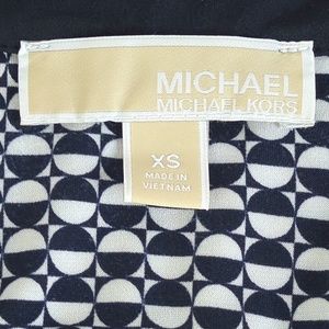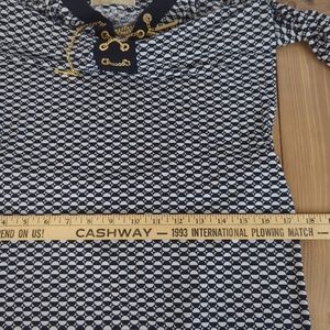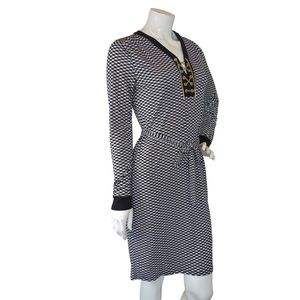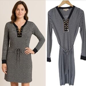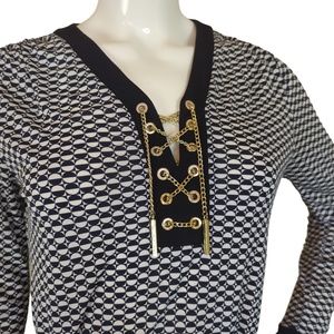 Black and white dress with self tie belt and gold tone grommet lace up detail.