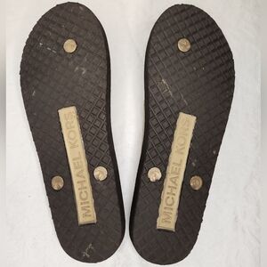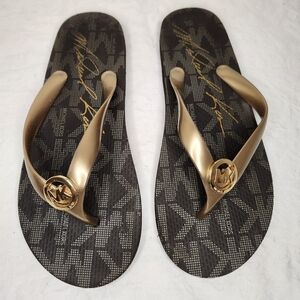 Stylish flip flops with gold straps. Features signature MK logo. Comfortable and chic design. New. With box. Authentic.