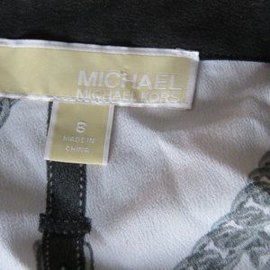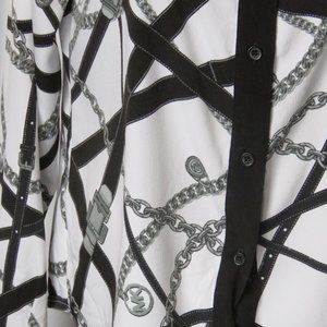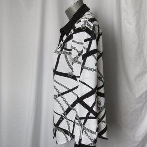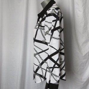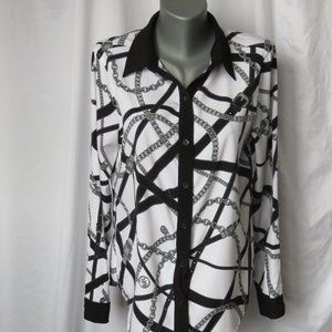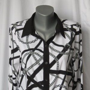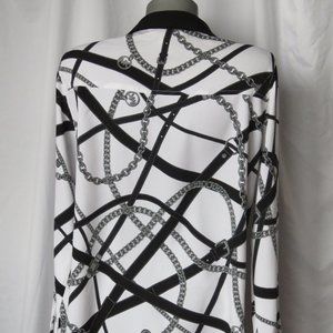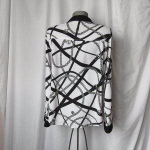 Stylish blouse with abstract black and white pattern. Button-up front. Long sleeves with black cuffs. Perfect for a chic look.