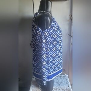 Michael Kors Blue and White Square Print Long Sleeve Cold Shoulder Top M