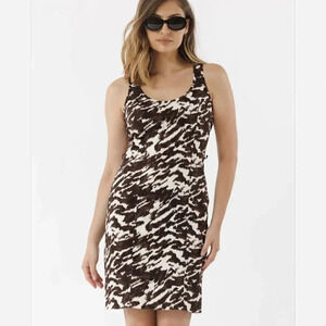 The fitted silhouette of the dress accentuates your curves, creating a flattering and alluring look. The brown and cream animal print adds an element of wild charm, making it a standout piece for any occasion. The dress features a unique cut-out detail on the back, adding a touch of edgy elegance to the design.