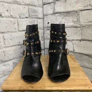 Michael Kors Bryn Black Leather Gold Studded Open Toe Stiletto Ankle Bootie
