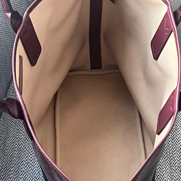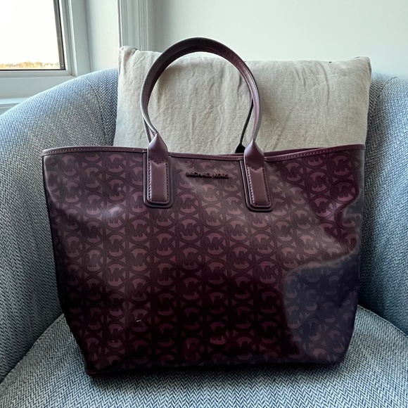 Elegant Michael Kors tote in rich burgundy. Features signature pattern. Perfect for everyday use.