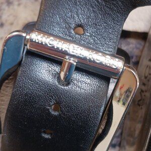 Michael Kors Carla Black Leather Platform Open Toe Cone Heels in size 8.5. These stylish heels feature black leather straps, a stacked cone heel, an open toe design, and a buckle ankle closure. They have a 1" platform and a 4.5" heel height. Perfect for adding a touch of sophistication to any outfit. Size 8.5