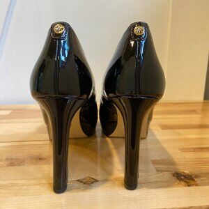 Stunning Michael Kors Chantal Black Faux Patent Leather stilettos Platform Pumps With Gold Logo Detail Size 6.5