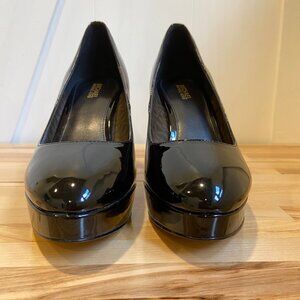Michael Kors Chantal Black Faux Patent Leather Platform Pumps With Gold Logo Det
