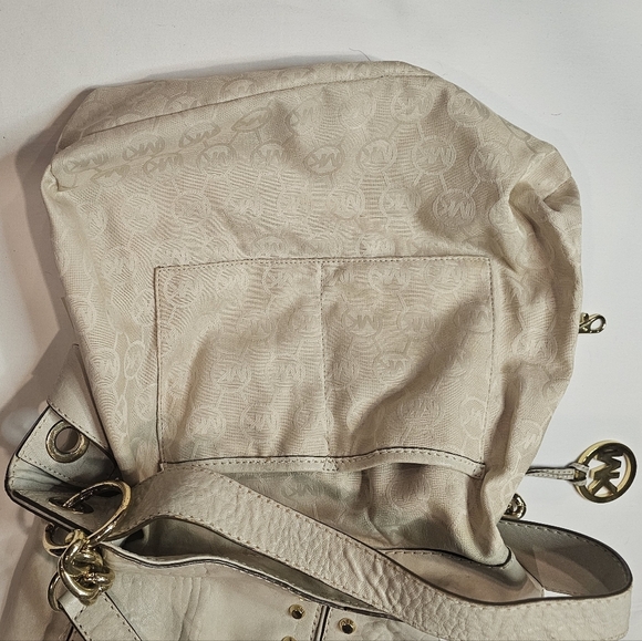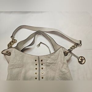 Elevate your style with this elegant Michael Kors cream leather tote bag. Perfect for any occasion, this bag combines luxury and functionality.