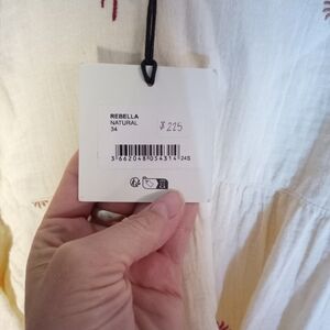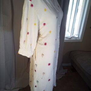 Elegant cream midi dress. Features multicolor embroidered accents. Button-down front. Perfect for casual outings.