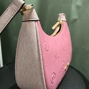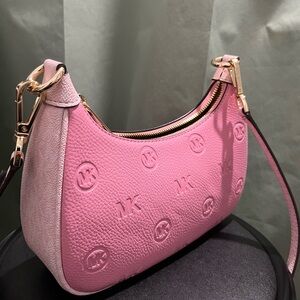 Elegant pink shoulder bag with embossed MK logo. Features gold-tone hardware. Perfect for adding a pop of color.