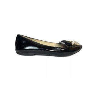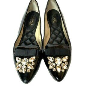 Pointed closed-toe flats with jewel embellishments at the toe.