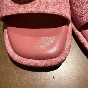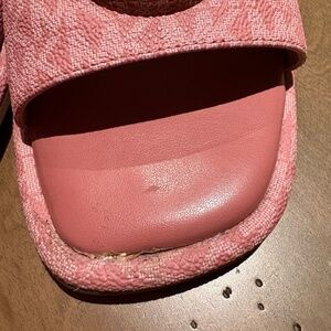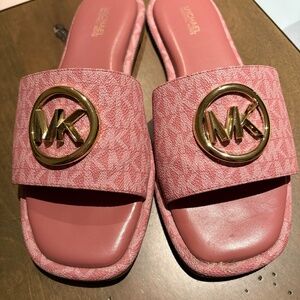 Michael Kors flat sandals in the color pink. Big MK logo design on the front. Very comfortable. Size is 7.5.