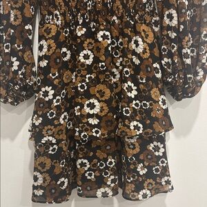 Elegant long sleeve dress with floral pattern. Features a mix of brown and white hues. Ideal for versatile styling. Please see last photo for snag pictured on dress. :) Its not obvious as its on the layered part if the bottom of the dress.