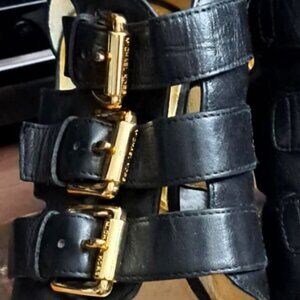 Authentic Michael Kors brand. Pretty genuine soft thick leather heels with a fashion statement, perfect for making a bold statement at any event. The exterior of the shoes looks new and shows no signs of scratches. Overall, the gold-tone accents hardware are very high quality. Heels are 3.5" high. Gently worn occasionally and cared for beautifully. Well-kept. Well sanitized. The inner heels have tiny flakes and minimal signs of wear at the inner back [please see photos]. This minor imperfection does not detract from the overall elegance and functionality. Well-kept. Well sanitized.