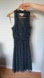 DESCRIPTION: This dress features a gorgeous print in blue and black and a stretchy comfortable fit. V neck line. Floaty tulle type of outer material with inner black lining. Ruching at waist. Pullover style.