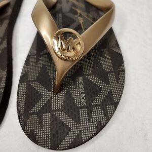 Strappy Gold rubber Flip-flop Slide Sandals with Monogrammed Black rubber soles, by MICHAEL KORS.