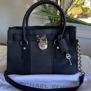 Black & silver tone Michael Kors Hamilton Microstud Saffiano Leather Satchel Shoulder Bag. Features top snap closure, Mk Lock and key charm, dual top rolled handles, leather & chain shoulder strap, (not removeable), 2 interior wall pockets + zip pocket, key hook, logo jacquard lining, logo base feet, dust bag.
