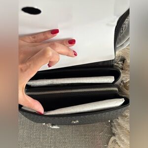 • Interior includes: back zip pocket, center zip compartment, and front slip pocket