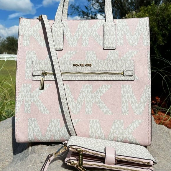 Michael Kors Kenly XL Tote Graphic Logo Vanilla MK Pink + Double Zip Wristlet