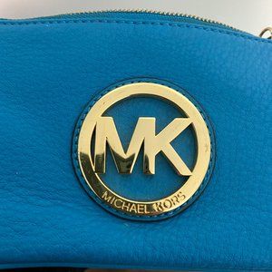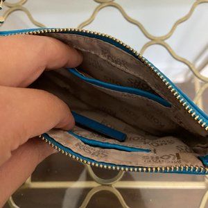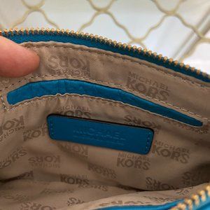Michael Kors blue wristlet with gold detailing. Two pockets on the inside of the wristlet. The wristlet strap can be removed via the lobster clasp and can be used as a wallet.