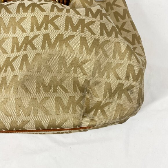 Used Michael Kors logo print beige fabric bag with brown leather strap/handle with logo charm and tassel, Does show some marks and wear as shown in photos.