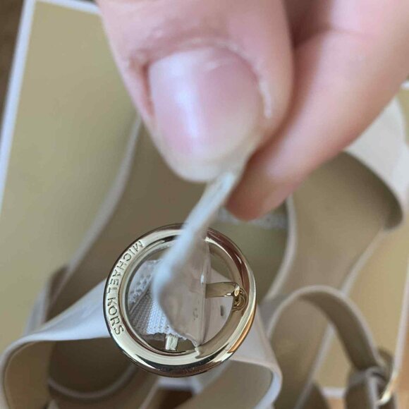 Add a touch of elegance to your wardrobe with these classic Michael Kors block heel sandals. Featuring a sleek light pink patent finish, a comfortable 2.5" block heel, and a gold buckle ankle strap, they’re the perfect versatile shoe for weddings, summer parties, or a polished everyday look.