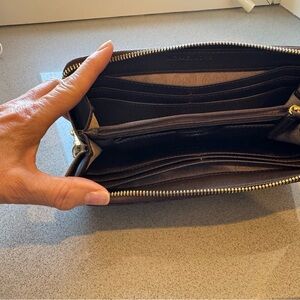 Elegant dark brown wallet with zip closure. Features a wrist strap and subtle pattern.
