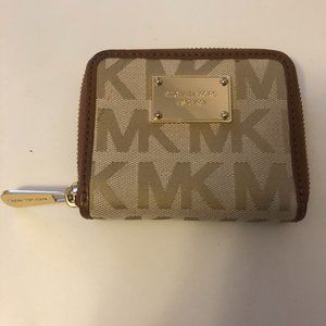 Michael Kors Logo Zipper Wallet. Authentic. Tan and Gold. Never used. Excellent condition. Size 4.5 inches wide by 3.5 inches high by 0.75 inches depth.