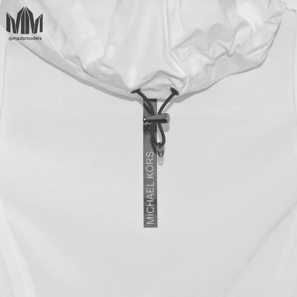 This lightweight long white raincoat from Michael Kors features an adjustable waistline and hood to flatter all your curves and highlight your personal figure. The black-silver metal detailing adds a sleek edge to your look while subtly playing on the logomania trend with the brand's signature "MK" logo. It features a white mesh interior lining and two zipper front pockets to keep all your personal belongings safely secured. The versatile monochrome colours are guaranteed to match with any outfit. It is the perfect light outerwear piece for those interested in the minimalist techwear aesthetic! Conveniently machine washable in cold water.