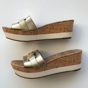 Michael Kors MK Warren Leather Platform Cork Slide Sandals Gold Logo Plate 10M