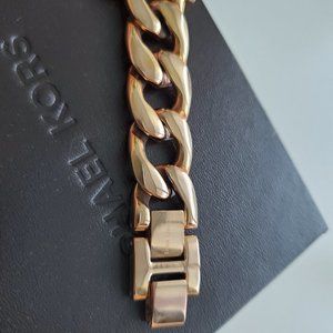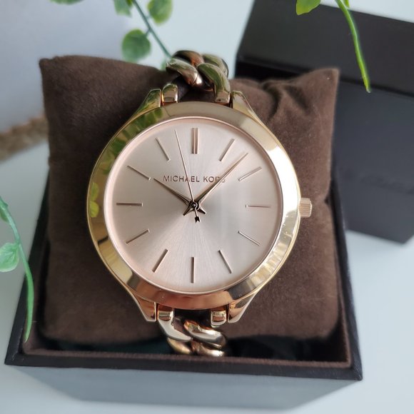 A legacy Michael Kors watch for sale! The Slim Runway watch (MK3223) is no longer in stock and this one has been kept in very good used condition. This beautiful style features a glowing rose gold colour, 39mm dial, 5 ATM water resistance, and a flat curb chain band. There are some signs of normal wear and slight metal discolouration near the clasp. The watch face, however, has no damages, no scratches, and no discolouration. The clasp is tight, secure, and in perfect working condition. This listing will include the original Michael Kors box, pillow, booklet, and extra links. Important: You will need to replace the battery upon receipt.