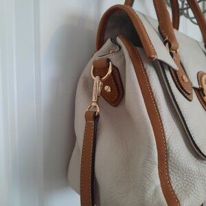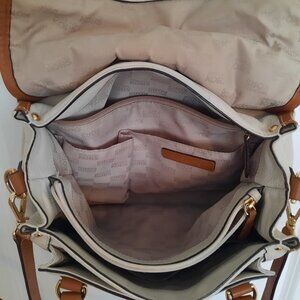 Used creme Michael Kors Satchel Bag with a few damages circled in the pictures and dimensions listed.