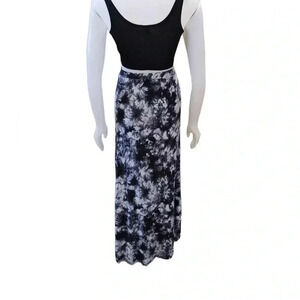 Shades of black and gray, this maxi, A-line features an elasticized waistband and has plenty of stretch available.