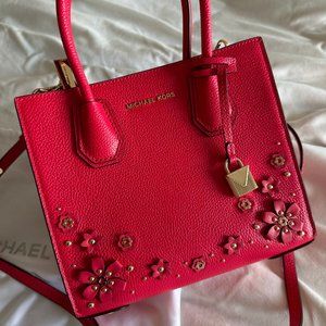 Michael Kors Mercer Pebbled Leather Messenger Crossbody Bag Deep Pink Floral