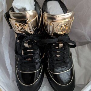 BNIB Gorgeous Michael Kors Nikko high top wedges. Shiny black and gold. Size 8