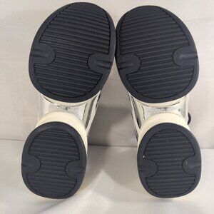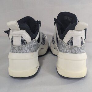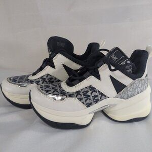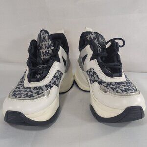 Michael Kors Olympia Logo Jacquard Leather Trainer Shoe 7.5 M Navy Blue White MK