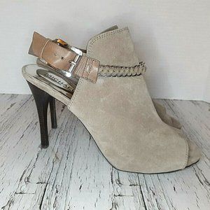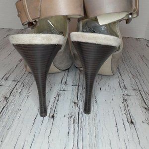 Gorgeous mushroom/sand color peep toe heel with chain strap detail and buckle closure. Elegant style and comfortable fit. Womens size 9M.