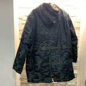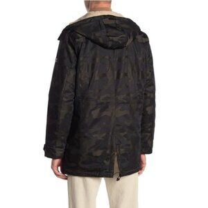 Stay warm in this cozy faux shearling line camo print hooded jacket.