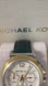 Stylish watch with gold accents and white face. Features chronograph and date function.