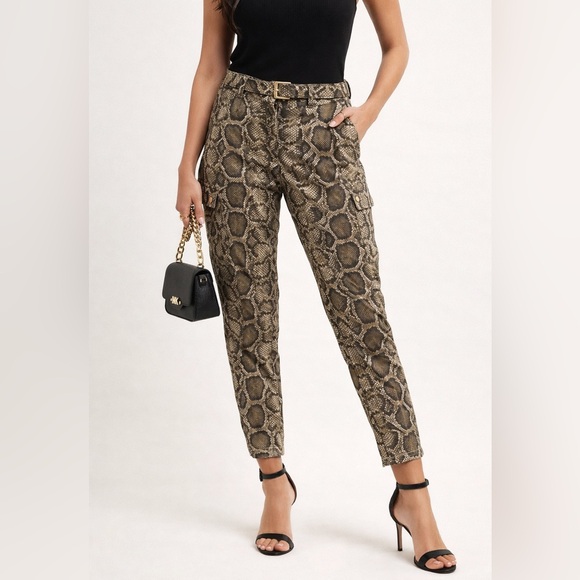 Beautiful straight leg pants with cargo pockets gold zippers and back zippered pockets. Belt included. All gold hardware very chic