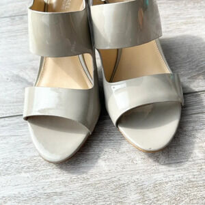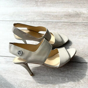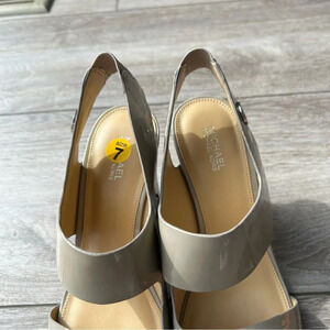 Michael Kors ROCHELLE SILVER LOGO TAUPE PATENT SLINGBACK SANDALS